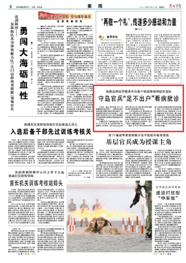 東瑁洲島位于祖國南部沿海,面積僅0.83平方公里,島上自然條件艱苦,高溫潮濕,臺(tái)風(fēng)頻發(fā)。連隊(duì)官兵出島交通條件不便,加之島上醫(yī)療條件有限,看病難問題長(zhǎng)期困擾著守島官兵。