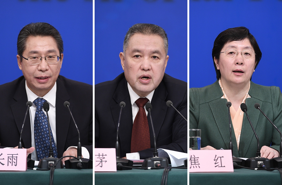 3月11日,十三屆全國人大二次會議新聞中心舉行記者會,邀請國家市場監(jiān)督管理總局局長張茅(中)、國家藥品監(jiān)督管理局局長焦紅(右)、國家知識產(chǎn)權(quán)局局長申長雨(左)就“加強市場監(jiān)管 維護市場秩序”相關(guān)問題回答中外記者提問(拼版照片)。新華社記者 王鵬 攝