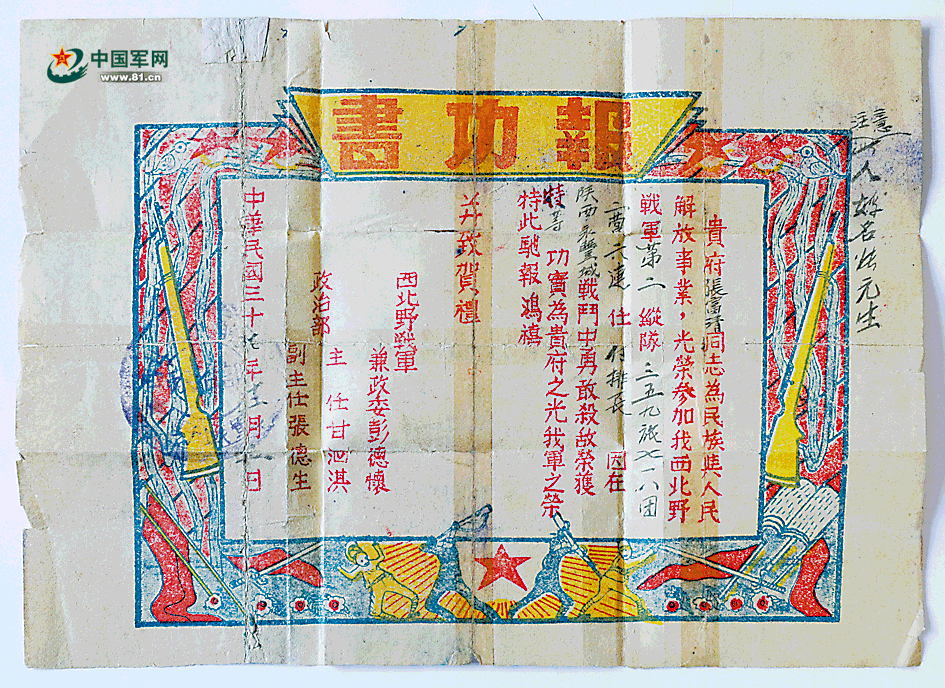 解放戰(zhàn)爭(zhēng)時(shí)期,張富清立功獲得的“報(bào)功書”。