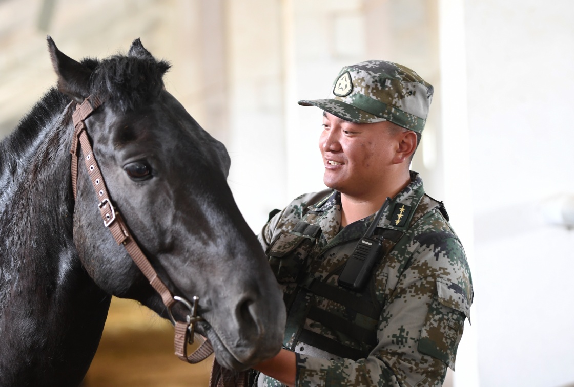 西部戰(zhàn)區(qū)陸軍某旅玉樹獨立騎兵連連長尼都塔生與“無言的戰(zhàn)友”親切交談(7月6日攝)。新華社記者 張永進 攝