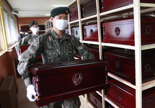 人民網(wǎng)韓國坡州3月27日電 今天早晨,437具中國人民志愿軍烈士遺骸開始從坡州起運(yùn)。韓方共準(zhǔn)備22輛車運(yùn)送,一位韓國軍人負(fù)責(zé)一個棺木。