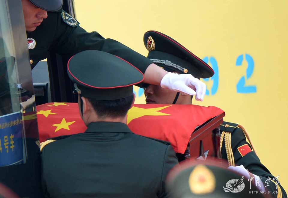 沈陽桃仙國際機(jī)場,禮兵們護(hù)送68具烈士遺骸棺槨踏上祖國大地