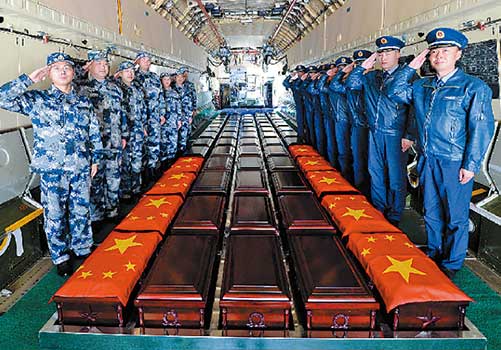 此次英魂歸來,祖國給予最高禮遇。3月20日上午,在韓國仁川機場舉行交接儀式后,我方禮兵雙手托起烈士遺骸棺槨,列隊登上等候在一旁的我空軍接運專機。11時30分許,運載68具烈士遺骸棺槨的伊爾76運輸機進入中國領空后,在我兩架殲-11B戰(zhàn)機的護送下,穿云破霧,緩緩降落在沈陽桃仙機場。這是我國首次派空軍專機赴韓國接迎志愿軍烈士遺骸。