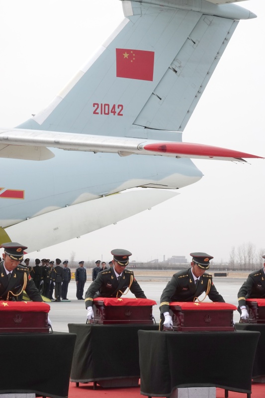 當日,第五批在韓中國人民志愿軍烈士遺骸由我空軍專機護送從韓國接回遼寧沈陽,20位志愿軍烈士英靈回到祖國和人民懷抱。新華社記者 李剛 攝