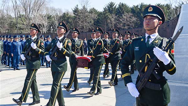 3月29日,禮兵在安葬儀式上護(hù)送志愿軍烈士遺骸棺槨。新華社記者 楊青 攝