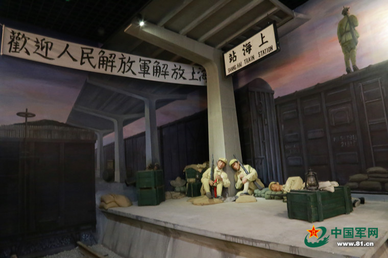 八連連史館中展示的八連官兵初入上海夜宿站臺(tái)時(shí)的場景。