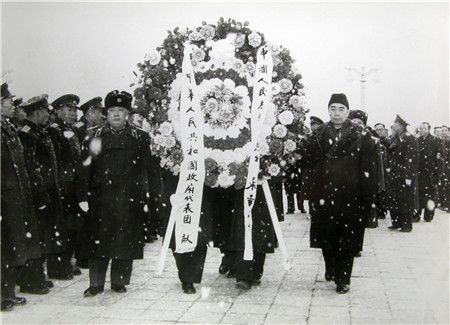 1958年,周恩來總理率領(lǐng)我國政府代表團訪問朝鮮時,冒著大雪到志愿軍烈士陵園敬獻花圈。