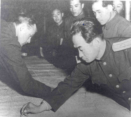 1951年11月27日,朝鮮停戰(zhàn)談判雙方代表在標(biāo)示“聯(lián)合國軍”和朝中軍隊軍事分界線的地圖上簽字,停戰(zhàn)談判雙方就第二項議程達成協(xié)議。