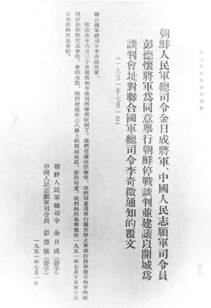 7月1日,金日成、彭德懷答復李奇微,同意舉行談判,建議以“三八線”上的開城為停戰(zhàn)談判會址。
