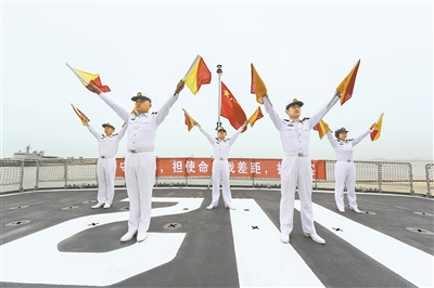 活動(dòng)中,哈爾濱艦艦員們打出“不忘初心”的旗語。王 游攝