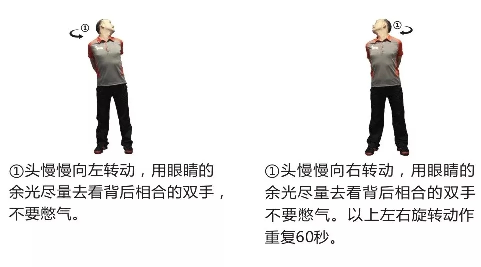 練習(xí)時,起始動作要求端正地坐在椅子上,自然呼吸,目視前方,雙手臂下垂,雙腳平行,腳尖指向正前方,各節(jié)動作都以此為開始。