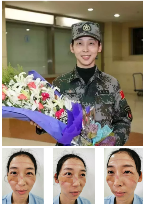 陸軍軍醫(yī)大學(xué)醫(yī)療隊(duì)員蔣小娟特意在鼻梁和兩側(cè)蘋果肌貼上創(chuàng)可貼緩解護(hù)目鏡的壓傷痛