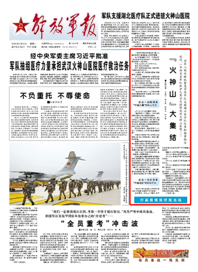 經(jīng)習主席批準,軍隊抽組1400名醫(yī)護人員于2月3日起承擔武漢火神山新型冠狀病毒感染肺炎??漆t(yī)院醫(yī)療救治任務。