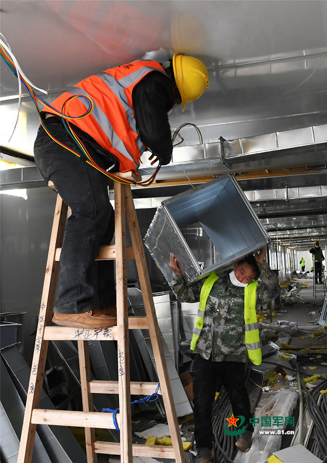 2月1日,武漢火神山醫(yī)院建設工地工人在加緊安裝污水排放設備。中國軍網(wǎng)記者 王傳順 攝