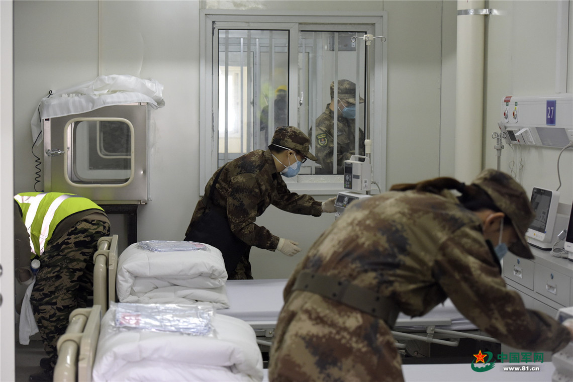 2月3日,軍隊支援湖北醫(yī)療隊隊員進入武漢火神山醫(yī)院病房完成各項準(zhǔn)備工作。中國軍網(wǎng)記者 范顯海 攝