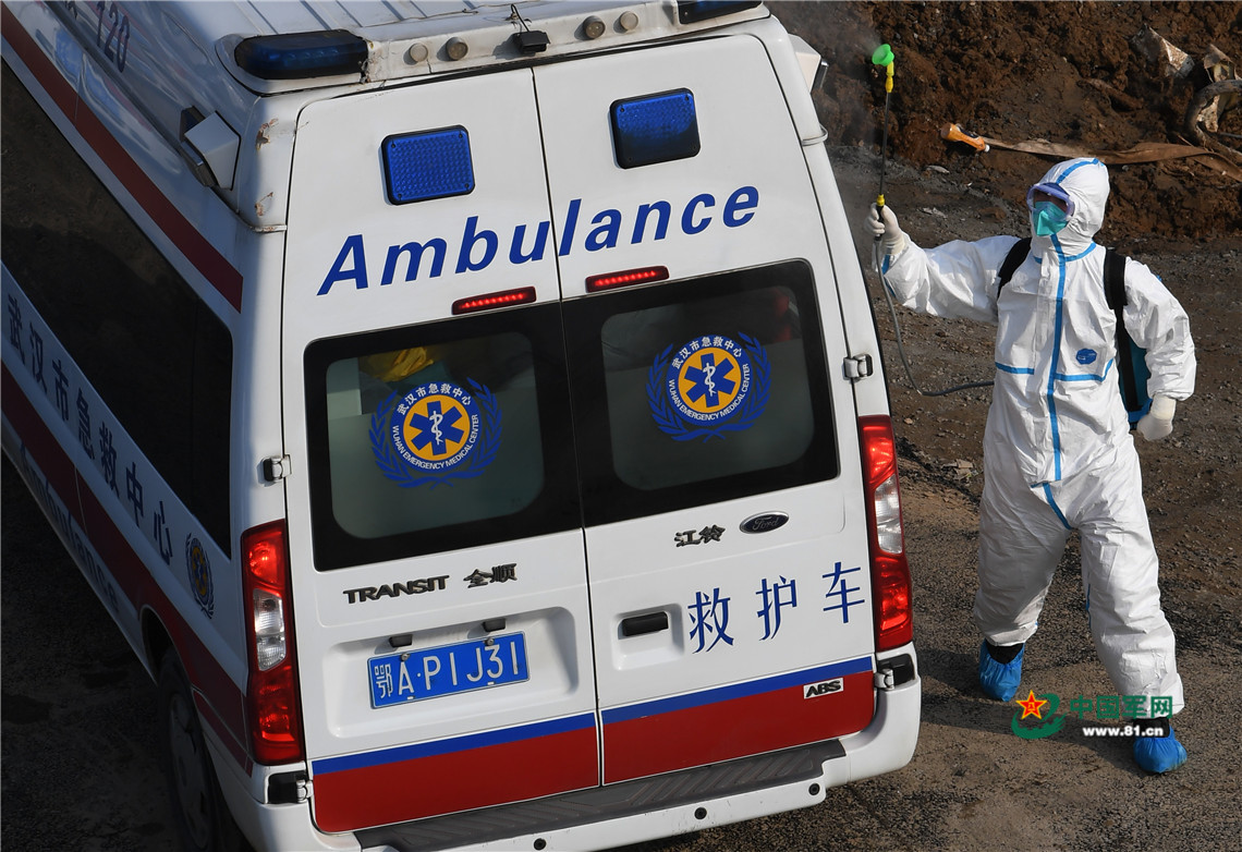 2月4日上午,武漢火神山新型肺炎??漆t(yī)院今日收治首批患者。這是工作人員給救護(hù)車消毒。解放軍報(bào)記者 王傳順 攝