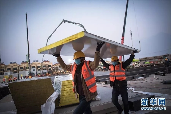 1月28日,在武漢火神山醫(yī)院建設(shè)工地,來自中建三局的工人在加緊施工。新華社記者 肖藝九 攝