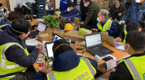 1月24日,中國移動突擊隊員到火神山醫(yī)院開展了現(xiàn)場查勘工作,確定了網(wǎng)絡建設和保障方案,除夕夜里連夜施工。