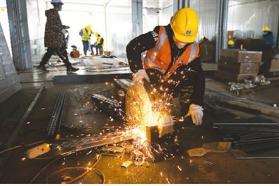 1月31日,工人在切割鋼管,制作醫(yī)院鋼結(jié)構(gòu)坡道和樓梯。