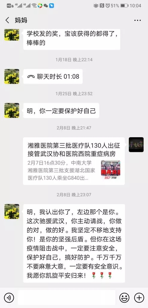 考慮父母年紀(jì)大了,不想讓他們擔(dān)心,所以來(lái)武漢一直沒有告知。下午爸媽撥打我手機(jī)3次,沒想好怎么回復(fù),一直沒敢接。第二天一早,爸爸發(fā)來(lái)微信:“爸媽知道了,注意保護(hù)自己,你是我們的驕傲,全家給你祈福,盼著你平安回家”。瞬間淚目......