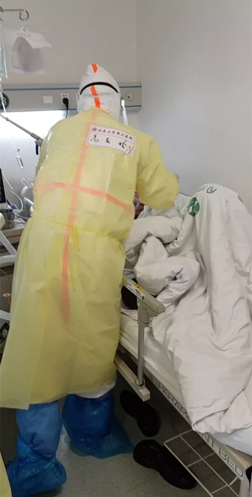 忙忙碌碌三小時(shí)飛馳而過,夏老師進(jìn)來(lái)接班,我卻發(fā)現(xiàn)他們只進(jìn)來(lái)三個(gè)人,詢問后得知防護(hù)用具告急,隊(duì)員沒有防護(hù)用品,無(wú)法進(jìn)入病房!我再次主動(dòng)請(qǐng)戰(zhàn)留下來(lái),幫助夏老師完成接下來(lái)的三小時(shí)戰(zhàn)斗。