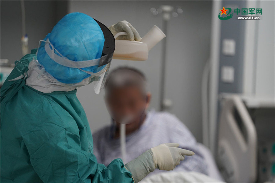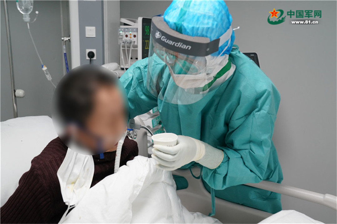 在火神山重癥醫(yī)學(xué)一科,護士正在幫助患者喝水。