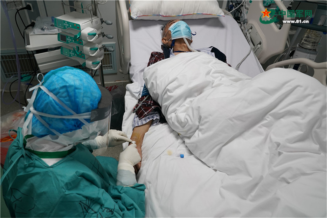 在火神山重癥醫(yī)學(xué)一科,護士仲雅正在為患者采集動脈血,用于檢查血氣指標(biāo)。