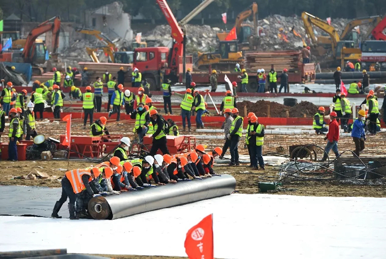 火神山現(xiàn)場(chǎng)黨員突擊隊(duì)正在鋪設(shè)HDPE膜