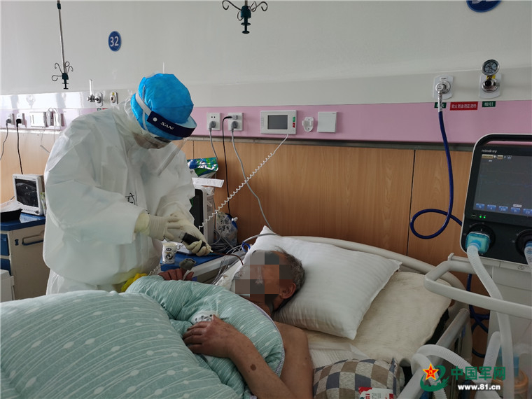 在ICU,鄭潔在通過鼻飼管,為一名昏迷的老年病人喂藥。