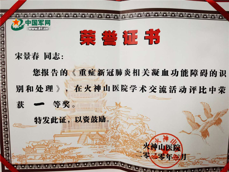 宋景春在血栓與止血領(lǐng)域具有深厚造詣,征戰(zhàn)火神山醫(yī)院后,他一邊與死神搶奪患者生命,一邊擠時(shí)間研究病例、總結(jié)經(jīng)驗(yàn)。他把平時(shí)鉆研的凝血技術(shù)和新冠肺炎重癥患者進(jìn)行比對(duì)總結(jié),執(zhí)筆的《新冠病毒感染肺炎相關(guān)凝血障礙診療專家共識(shí)》受到專家們充分肯定,所作的《重癥新冠肺炎相關(guān)凝血功能障礙的識(shí)別和處理》報(bào)告也獲得火神山醫(yī)院首次學(xué)術(shù)活動(dòng)優(yōu)秀成果一等獎(jiǎng),為患者凝血功能障礙的早期診療供了很好的解決思路。