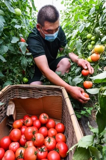 ▲在徐亞波團隊通州基地的西紅柿大棚里,團隊成員親自采摘使用中國農科院技術種植的高品質無公害西紅柿,準備第二天送到社區(qū)。