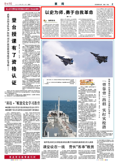 “天下不能常治,有弊所當革也;猶人身不能常安,有疾所當治也”。軍隊各級黨組織領(lǐng)導部隊建設和軍事斗爭準備工作,地位重要、責任重大。黨史學習教育中,廣大黨員要充分發(fā)揚自我革命的精神,用好批評和自我批評這個銳利武器,馳而不息抓好正風肅紀反腐,切實把全面從嚴治黨、全面從嚴治軍的螺絲擰得緊而又緊。必須堅決同一切可能動搖黨的根基、阻礙黨的事業(yè)的現(xiàn)象作斗爭,努力把我們黨建設得更加堅強有力,開創(chuàng)新時代軍隊黨的建設新局面。