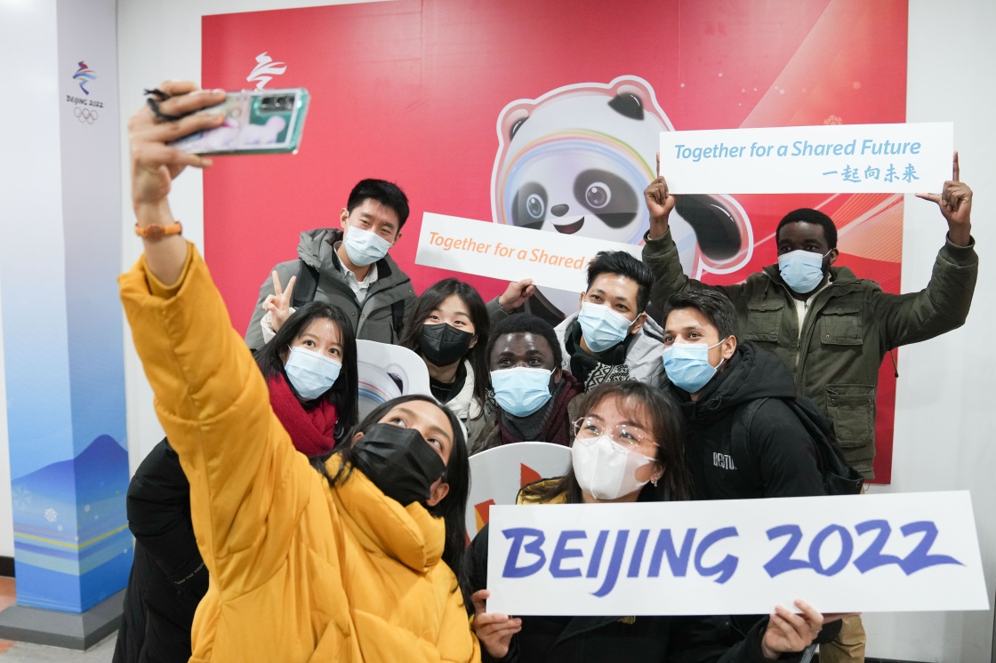 2021年12月30日,參加場(chǎng)館培訓(xùn)的外籍志愿者在北京五棵松體育中心合影。新華社記者 鞠煥宗 攝