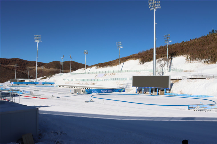 據(jù)國家冬季兩項中心場館和基礎設施經(jīng)理陳國徽介紹,為保證賽時的觀賽體驗,國家冬季兩項中心以技術樓為中心,將看臺搭建在技術樓下方及兩側,前端為射擊靶場及罰圈區(qū),中間則設置了兩條賽道,這樣就在小范圍內(nèi)形成了一種“環(huán)抱”的緊湊格局,加上現(xiàn)場有97座照明燈的保障,非常利于現(xiàn)場觀賽及賽事轉播工作。而技術樓的東西兩側還設置了兩個大屏幕,現(xiàn)場觀眾和工作人員通過大屏幕就可以看到遠端賽道進行的實時賽況。