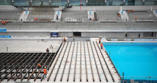 2019年7月10日,正在進(jìn)行冰場(chǎng)可轉(zhuǎn)換結(jié)構(gòu)施工的“水立方”。新華社記者鞠煥宗攝