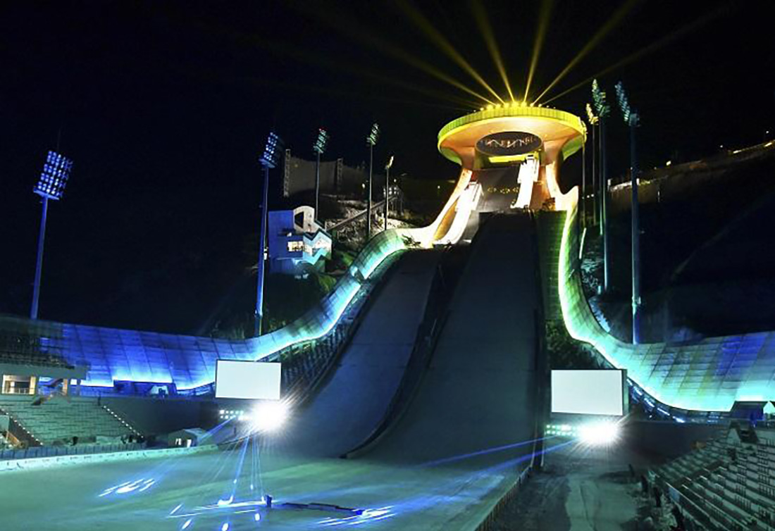 國家跳臺滑雪中心是世界上體量最大的跳臺滑雪場館,其主體建筑設(shè)計靈感來自中國傳統(tǒng)飾物“如意”,因此被形象地稱作“雪如意”。如果說由兩個巨大支柱支撐、半懸浮于空中的頂峰俱樂部是“雪如意”的“柄首”,那么,蜿蜒起伏的S型賽道便是它的“柄身”,最底部的結(jié)束區(qū)和觀眾區(qū)則是它的“柄尾”,在展現(xiàn)體育競賽場館動感的基礎(chǔ)上,凸顯了中國元素。