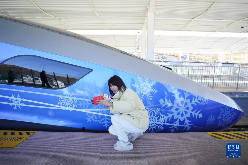 這是1月6日在京張高鐵太子城站拍攝的G9981次北京冬奧列車車身上的冬季運(yùn)動涂裝。