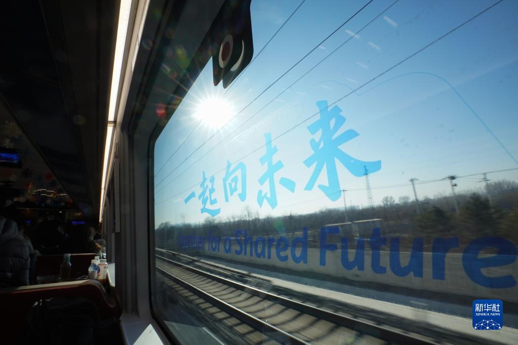 這是1月6日拍攝的G9981次北京冬奧列車車窗上的北京冬奧會和冬殘奧會主題口號。