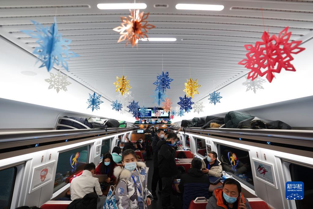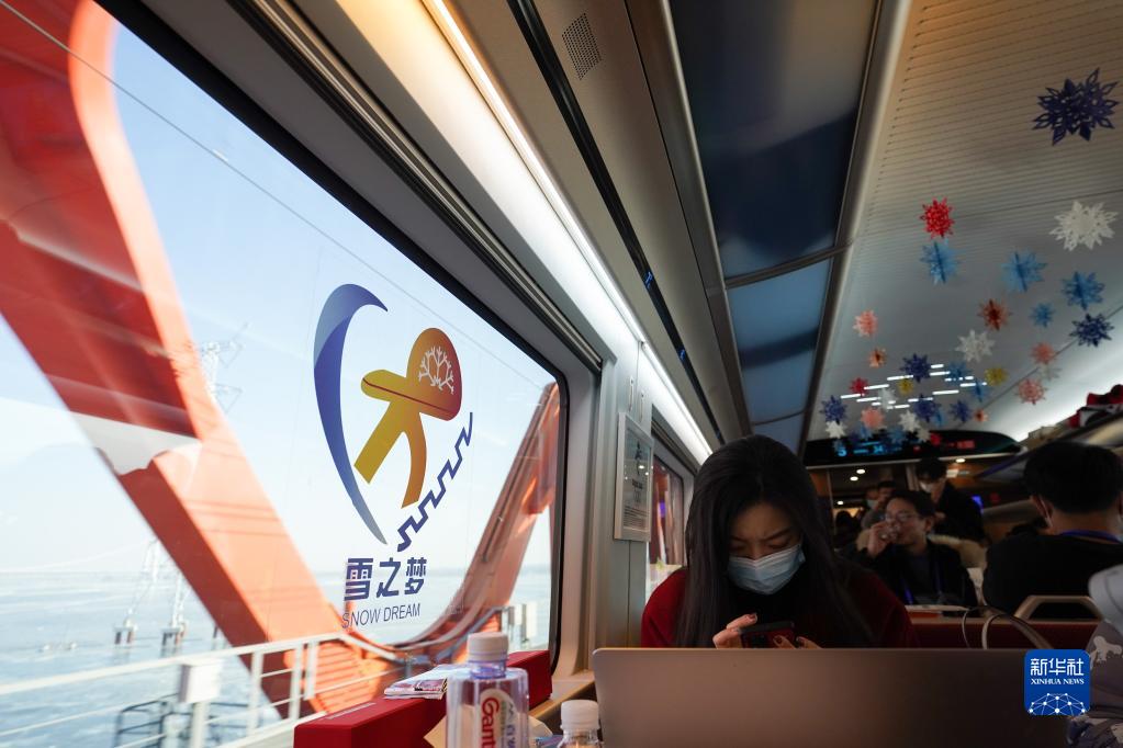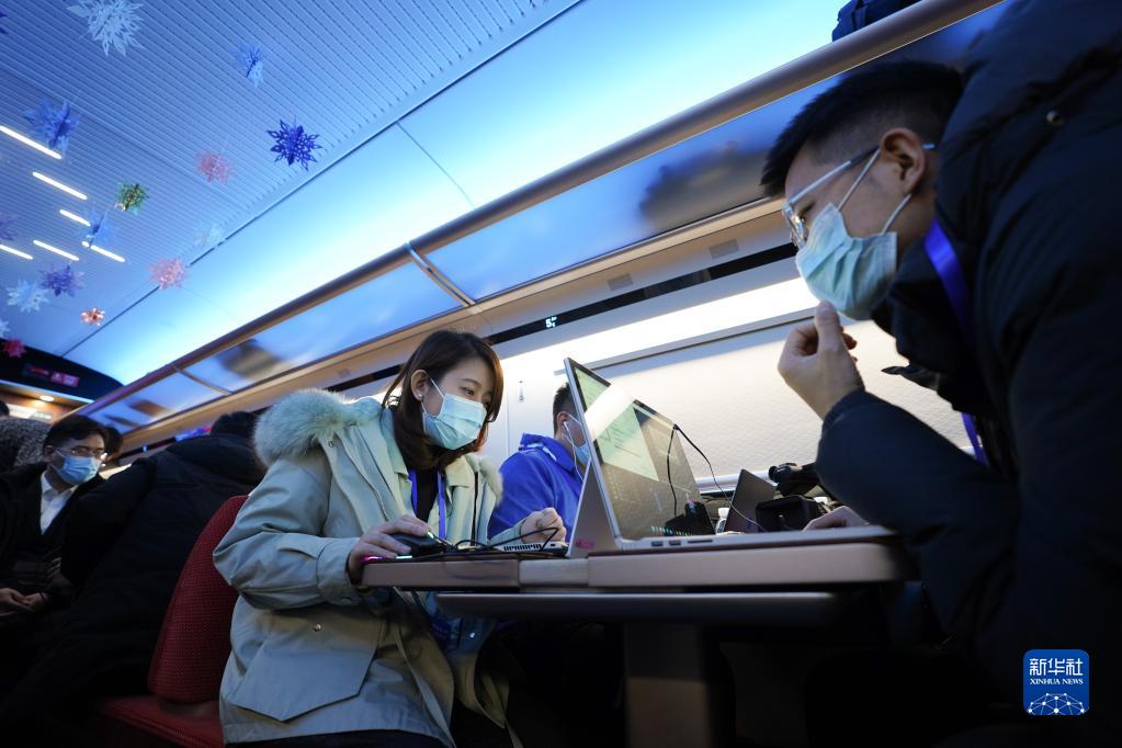 1月6日,在G9982次北京冬奧列車媒體車廂內(nèi),媒體記者在工作。