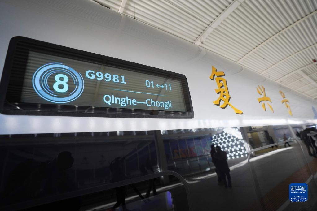 當(dāng)日,北京冬奧列車亮相京張高鐵。據(jù)介紹,北京冬奧列車全部使用時(shí)速350公里復(fù)興號動車組開行,并配備5G超高清演播室。冬奧列車編組8輛,定員564人,外觀采用“瑞雪迎春”涂裝方案,彰顯冬奧主題。