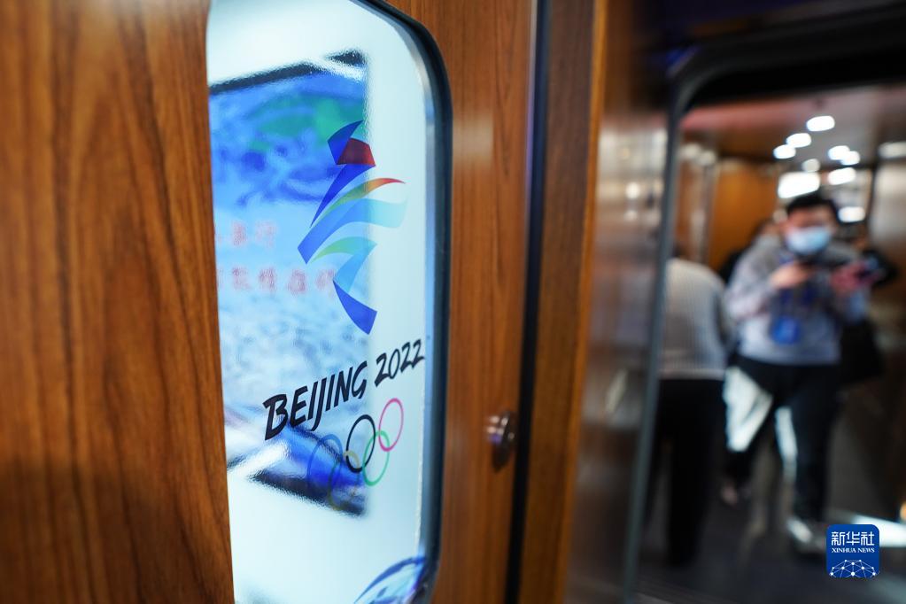 這是1月6日在G9981次北京冬奧列車內(nèi)拍攝的北京2022年冬奧會會徽。