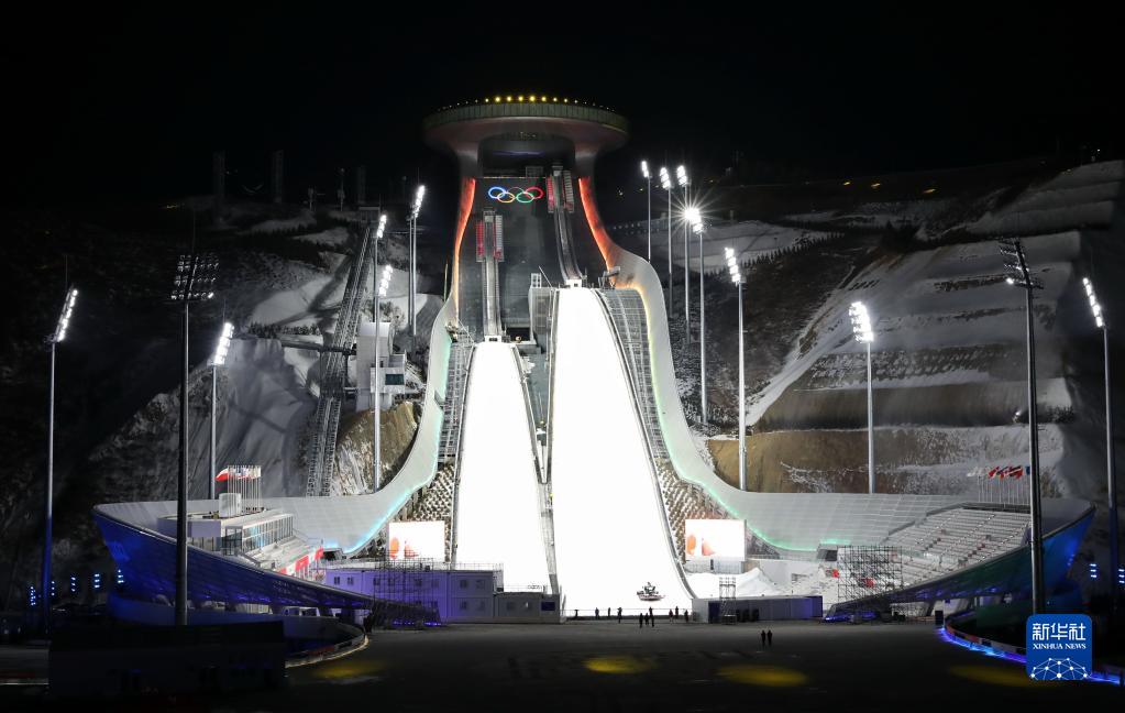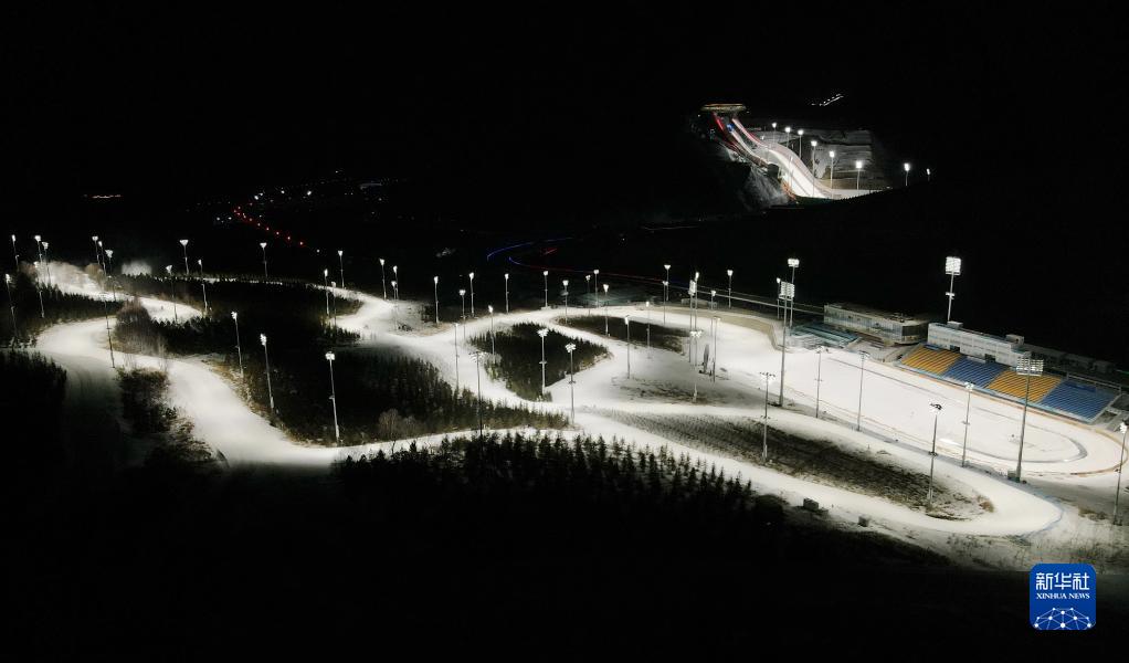 這是張家口賽區(qū)國家越野滑雪中心(下)與國家跳臺滑雪中心(上)夜景(2021年2月30日無人機(jī)照片)。新華社記者 楊世堯 攝