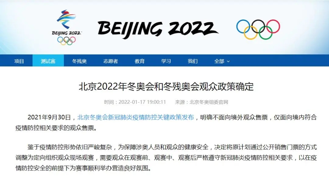 據(jù)北京冬奧組委官網(wǎng)消息,2021年9月30日,北京冬奧會新冠肺炎疫情防控關(guān)鍵政策發(fā)布,明確不面向境外觀眾售票,僅面向境內(nèi)符合疫情防控相關(guān)要求的觀眾售票。