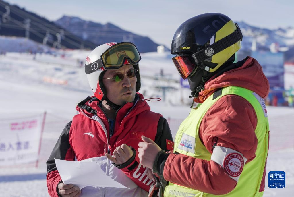 在新疆絲綢之路國際度假區(qū)滑雪場,塔里哈提·散塔依(左)和同事在交流雪道巡邏情況(1月11日攝)。