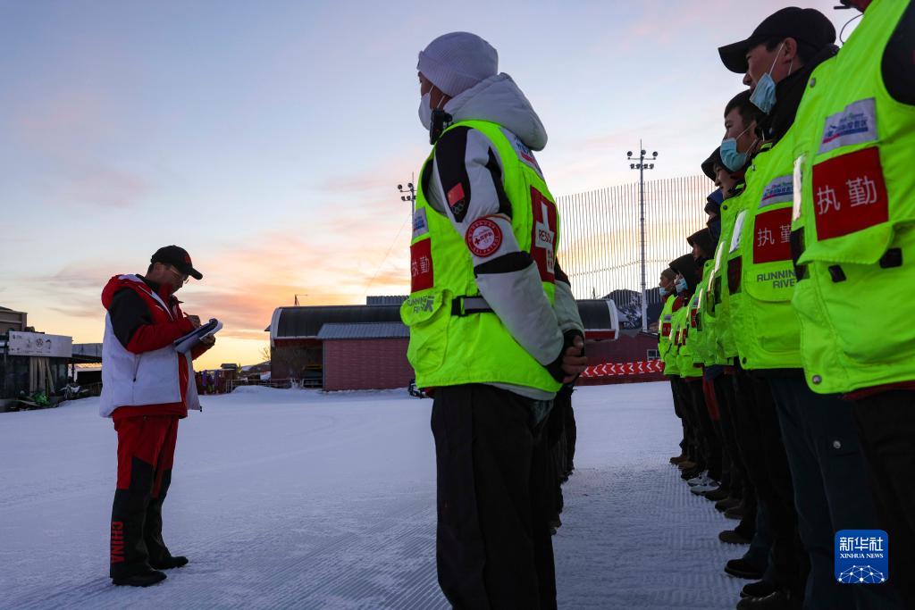 在新疆絲綢之路國際度假區(qū)滑雪場,塔里哈提·散塔依(左一)對高山滑雪救護隊進行點名,并囑咐安全事項(1月10日攝)。