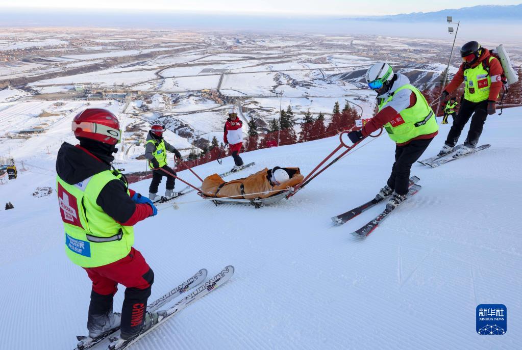 高山滑雪救護隊在新疆絲綢之路國際度假區(qū)艾文大道上進行救援演練(1月11日攝)。