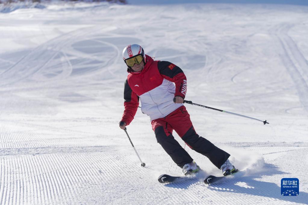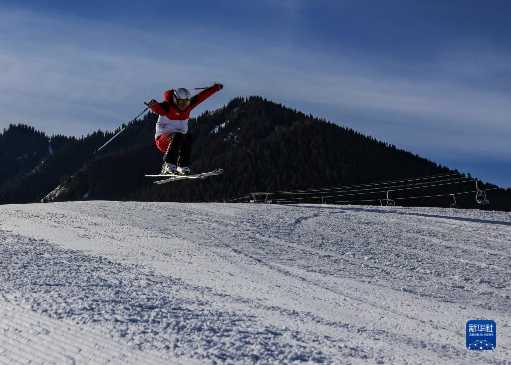 塔里哈提·散塔依在新疆絲綢之路國際度假區(qū)滑雪場內滑雪(1月11日攝)。