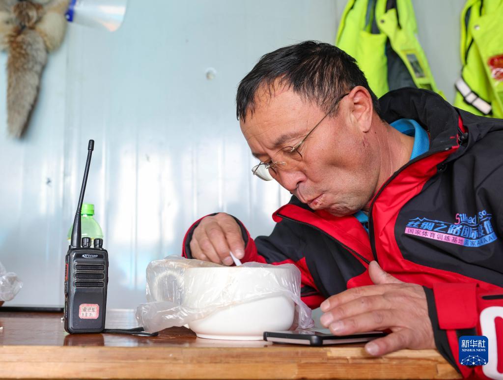 塔里哈提·散塔依邊吃午飯邊翻看手機上的巡道匯報信息(1月11日攝)。
