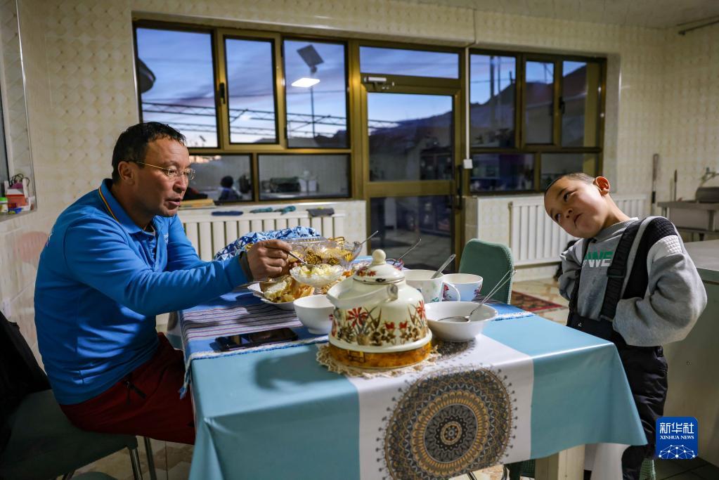 塔里哈提·散塔依(左)和兒子在家中吃早餐(1月11日攝)。
