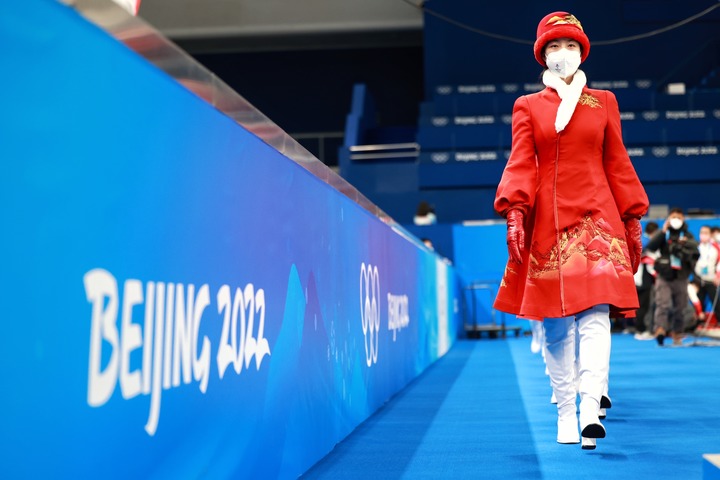 1月27日,禮儀人員在“冰立方”進(jìn)行演練。目前,北京冬奧會(huì)冰壺比賽場館國家游泳中心“冰立方”各項(xiàng)準(zhǔn)備工作進(jìn)入最后沖刺階段。(新華社記者劉續(xù)攝)